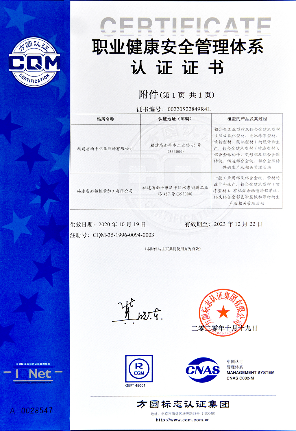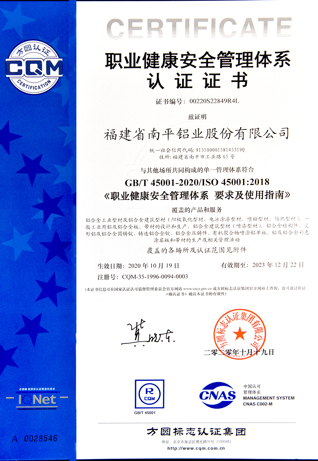 職業(yè)健康安全管理體系認(rèn)證證書
