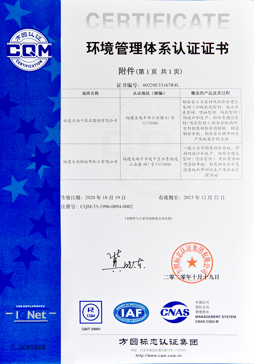環(huán)境管理體系認證證書
